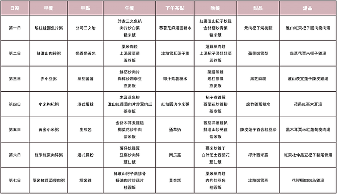 日期 | 早餐 | 早點 | 午餐 | 下午荼 | 晚餐 | 甜品 | 湯品 |